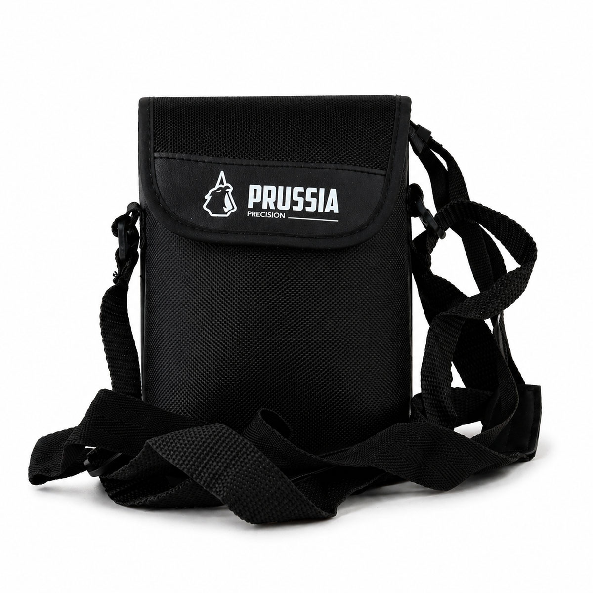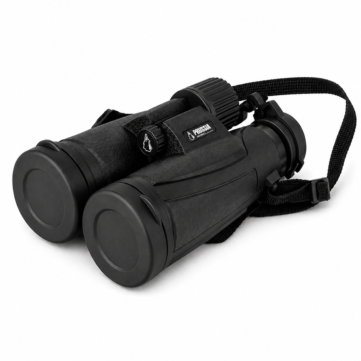 726529841114 The Prussia Precision 10×42 Binoculars are a versatile and reliable observation tool designed for hunting, outdoor use, travel, and professional field applications. With a powerful 10× magnification and a bright 42 mm objective lens, they deliver a clear and stable image for confident target identification and long-range observation. Built in a durable reinforced polycarbonate housing, the binoculars combine rugged construction with a secure, non-slip grip, ensuring reliable handling even with wet or dirty hands. The waterproof design makes them suitable for challenging weather conditions and demanding environments. Optically, the system features multilayer-coated glass lenses and a roof prism design, providing sharp image quality, good contrast, and comfortable viewing during extended use. Focus adjustment is smooth and precise through the central focusing wheel, while the right eyepiece includes diopter correction (±5) for individual vision adjustment. Twist-up eyecups allow the viewing distance to be set correctly for both eyeglass wearers and standard use, ensuring comfort and a consistent sight picture. With an angular field of view of 5.8° and a linear field of view of 110 m at 1000 m, the binoculars offer an excellent balance of magnification and situational overview. Compact enough for field carry yet powerful in performance, the Prussia Precision 10×42 binoculars are delivered as a complete kit including neck strap, protective pouch, lens caps, and cleaning cloth.