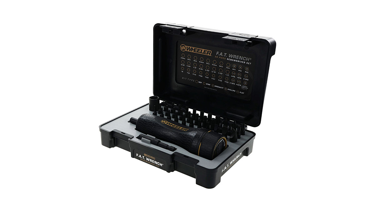 198700004661 When precision matters in your gunsmithing projects, the 38-Piece F.A.T. Wrench® Screwdriver Set is the tool of choice. This professional-grade set combines the iconic F.A.T. Wrench with 36 carefully selected bits and adapters, making it ideal for everything from scope bases and rings to action screws. The F.A.T. Wrench® features an adjustable torque range of 10–65 in-lbs, providing precise, repeatable torque for scope ring and base fasteners—helping prevent overtightening that could damage firearms or optics. Bits are black phosphate-coated for corrosion resistance and long-lasting durability. All components are neatly organized in a premium, stackable hard case that nests with other Wheeler sets. Equip yourself with the Wheeler F.A.T. Wrench® and work with confidence, knowing your rifle’s screws are tight and properly set.