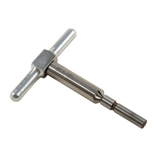 Ce cutter à chanfreiner à 45° casse les arêtes des rayures pour assurer une sortie de balle propre ou chanfreine les bouches de chambre des cylindres de revolver pour des recharges rapides. Le kit comprend le cutter, une poignée et un pilote, le tout dans une boîte en polypropylène. Le pilote interchangeable maintient le cutter correctement aligné. N'hésite pas à acheter des pilotes supplémentaires pour utiliser un seul cutter avec plusieurs calibres différents. Des pilotes pour d'autres calibres sont disponibles séparément.