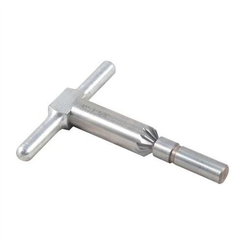 Le cutter à chanfrein de 45° casse les arêtes des rayures pour un passage de balle propre ou chanfreine les bouches des chambres de cylindre de revolver pour des recharges rapides. Il comprend le cutter, une poignée et un pilote, le tout dans une boîte en polypropylène. Le pilote interchangeable maintient le cutter correctement aligné. Tu peux acheter des pilotes supplémentaires pour utiliser un seul cutter avec de nombreux calibres différents. Des pilotes pour d'autres calibres sont disponibles séparément. Le cutter à 45° fourni dans les ensembles marqués d'un * a un diamètre de 5/8" pour chanfreiner correctement les bouches de canon et de cylindre plus larges de ces calibres. Tous les autres ensembles ont un cutter à ½" de diamètre.