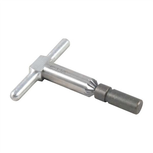050806017191 Le cutter à chanfrein de 45° casse les arêtes des rayures pour une sortie de balle propre ou chanfreine les bouches des chambres de cylindre de revolver pour des recharges rapides. Comprend le cutter, une poignée et un pilote, le tout dans une boîte en polypropylène. Le pilote interchangeable maintient le cutter correctement aligné. Achète des pilotes supplémentaires pour utiliser un cutter pour de nombreux calibres différents. Des pilotes pour d'autres calibres sont disponibles séparément. Le cutter à 45° fourni dans les ensembles marqués d'un * a un diamètre de 5/8" pour chanfreiner correctement les plus grandes bouches de canon et de cylindre sur ces calibres. Tous les autres ensembles ont un cutter à 45° de ½" de diamètre.En rupture de stock, environ 4-12 semaines à partir de l'entrepôt principal.