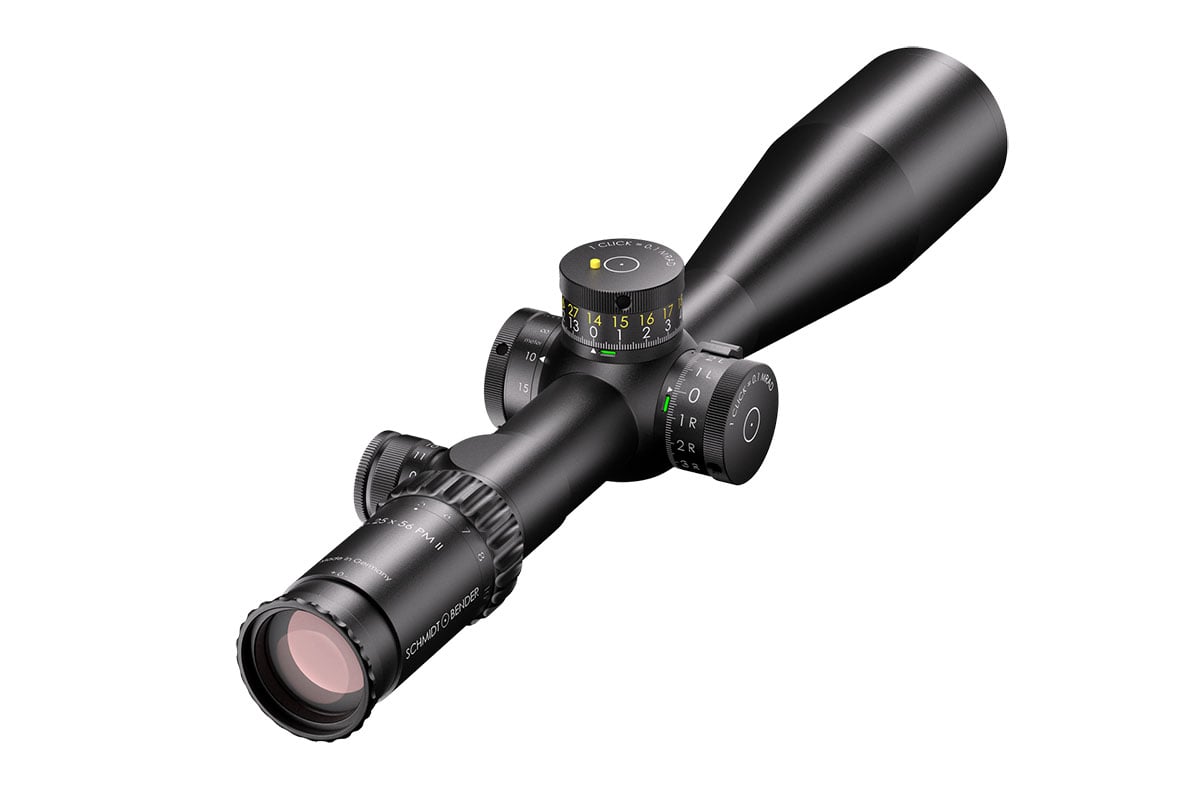 4060537065626 The 5‑25×56 PM II from Schmidt and Bender stands at the pinnacle of variable‑magnification tactical optics, engineered for long‑range precision, outstanding clarity and professional‑level reliability. With a wide 5–25× zoom range and a substantial 56 mm objective lens, it delivers exceptional light‑gathering capability, enabling crisp, bright imagery even at extended distances. Built upon a rugged 34 mm main tube, the scope accommodates large internal adjustment ranges and is designed for demanding use. It features a reticle in the first focal plane (FFP) so that scale and hold‑offs remain accurate at any magnification. The field of view spans approximately 5.3–1.5 m at 100 m, while the exit pupil ranges around 11.0–2.3 mm, and the eye relief remains generous at around 90 mm. The parallax adjustment typically extends from 10 m to infinity, enabling accurate focus from very close ranges through to extreme distances. The turret system is engineered for precision: click values as fine as 0.1 mrad (≈1 cm at 100 m) are available, and a double‑turn elevation turret combined with single‑turn windage allows vast usable correction ranges for wind and elevation. Optical transmission exceeds 90 %, and the construction is nitrogen‑filled, fog‑ and waterproof, ensuring full reliability in all climatic conditions. Key Specifications: Magnification: 5–25× Objective Lens Diameter: 56 mm Main Tube Diameter: 34 mm Field of View: approx. 5.3–1.5 m @100 m Exit Pupil: approx. 11.0–2.3 mm Eye Relief: approx. 90 mm Parallax Adjustment: from ~10 m to infinity Click Value: approx. 0.1 mrad (≈1 cm at 100 m) Optical Transmission: > 90 % Crafted in Germany to the highest standards, the 5‑25×56 PM II is the go‑to choice for military, law‑enforcement and competition shooters who demand absolute clarity, mechanical integrity and extreme flexibility in one optic.