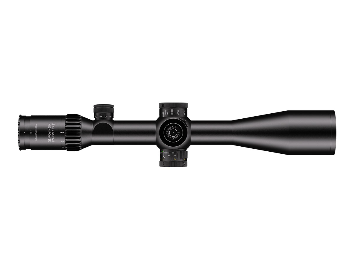 4060537027532 The 5–45×56 PM II High Power is a professional‑grade precision optic that merges a high‑performance riflescope with spotting‑scope capability. Designed for observation and ultra‑long‑range engagement, its enormous 9× zoom range (5–45×) makes it equally at home on reconnaissance, match, or tactical platforms where both identification and shot‑making accuracy are required. Engineered for extreme clarity and reach, the 56 mm objective delivers excellent light gathering while the optical system maintains a large usable field of view across the entire zoom range — allowing fast situational awareness at low magnification and razor‑sharp detail at high power. The reticle sits in the first focal plane, so hold‑offs and subtensions remain precise at any magnification. The model features robust, lockable turrets with fine 0.1 mrad click values and very large usable internal adjustment ranges tailored for extreme‑range correction. Built on a rugged 34 mm main tube, the High Power is constructed for demanding environments: it is fully weatherproof, fogproof and shock‑resistant. Despite its long reach, the design balances mechanical strength with practical ergonomics for field use. Standout Features Exceptional 5–45× magnification range for combined observation and precision shooting Large 56 mm objective for outstanding light transmission and image resolution First focal plane reticle for accurate ranging and holdover at any magnification Precision turrets with 0.1 mrad click value and extensive elevation/windage adjustment range Side/parallax adjustment for crisp focus from mid‑range to extreme distances High optical transmission (~90%) and illuminated reticle options for low‑light operations Robust 34 mm tube, weatherproof and built for professional use Key Specifications Magnification: 5–45× Objective diameter: 56 mm Main tube diameter: 34 mm Field of view: approx. 7.8–0.9 m @ 100 m Exit pupil: approx. 8.8–1.2 mm Eye relief: 90 mm Length: approx. 434 mm Weight: approx. 1,130 g Reticle: FFP (various tactical reticle options) Click value: 0.1 mrad Elevation adjustment range: ~27 mrad (internal ~29.6 mrad) Windage adjustment range: ±6 mrad (internal ~21.1 mrad) Parallax: adjustable Illumination levels: multiple (illuminated reticle available) Optical transmission: ~90% Designed and manufactured to professional standards, the 5–45×56 PM II High Power is the go‑to optic for operators and precision shooters who require unmatched versatility, extreme reach and uncompromising optical and mechanical performance.