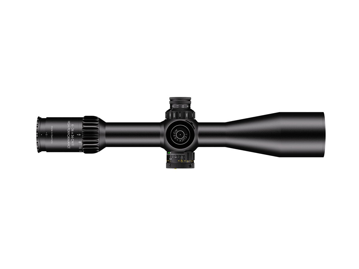 4060537070538 The 6‑36×56 CM II High Performance from Schmidt and Bender is a high-end precision riflescope engineered for medium to extreme long-range engagement. With a magnification range of 6–36× and a large 56 mm objective lens, it delivers outstanding clarity, resolution, and flexibility across demanding shooting scenarios. Its optical design provides an exceptionally large field of view for a scope in this class — even at the lowest magnification (6×), it outperforms many 5–25× scopes in terms of visual coverage. Advanced coatings ensure light transmission well over 90 %, enabling superb image brightness and contrast in challenging lighting conditions. Built on a 34 mm main tube, the scope is compact yet robust, with a length of approximately 390 mm and weight around 940 to 995 g, depending on configuration. Eye relief is generous at 90 mm, ensuring comfortable and safe use across rifle platforms. The turret system offers very large internal adjustment ranges (over 40 mrad, approx. 395 cm elevation at 100 m) and fine click values (e.g., 0.5 cm/100 m), making it well suited for precision ballistic correction at long distances. Side parallax adjustment and the integrated LPI system (illumination integrated into the parallax knob) enhance ease of use and compatibility for left-hand shooters. Key Specifications: Magnification: 6–36× Objective Lens Diameter: 56 mm Main Tube Diameter: 34 mm Field of View (approx.): 7.3–1.3 m @100 m Exit Pupil: approx. 8.3–1.6 mm Eye Relief: 90 mm Click Value: approx. 0.5 cm @100 m (configuration-dependent) Internal Elevation Adjustment: approx. 395 cm @100 m Weight: approx. 940–995 g Transmission: >90 % Tube Diameter: 34 mm Length: approx. 390 mm Reticle and Turret Configurations: Various high-end match/tactical setups available This scope is designed for marksmen, competition shooters, and professionals who demand the highest optical clarity, mechanical robustness, and long-range capability from one flagship optic.