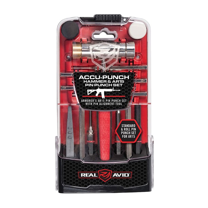 ACCU-PUNCH® HAMMER & PIN PUNCH SET FOR AR-15 The Real Avid Accu-Punch Hammer & AR-15 Pin Punch Set is a comprehensive toolkit designed specifically for AR-15 enthusiasts and gunsmiths, providing all the necessary tools for efficient assembly, disassembly, and maintenance of AR-15 rifles. Description and Features: Balanced Gunsmithing Hammer: The set includes a perfectly balanced hammer with a rubberized, ergonomic grip for comfortable and precise handling. Interchangeable Hammer Heads: Four interchangeable hammer heads—rubber, brass, steel, and nylon—allow Customers to select the appropriate material for specific tasks, minimizing the risk of marring or damaging firearm components. Comprehensive Pin Punch Selection: The kit offers a range of standard and roll pin punches essential for AR-15 maintenance: Standard Pin Punches: 3/32", 1/8", 9/64", 5/32" Roll Pin Punches: 1/16", 5/64", 1/8" 3/32" Bolt Catch Roll Pin Starter and Roll Pin Punch: Specialized tools designed for the bolt catch assembly. Non-Marring Finishing Punch: Ideal for tasks requiring a gentle touch to prevent surface damage. Staking Punch: Used for securing components in place. Pin Alignment Tool: A proprietary pin alignment tool simplifies the process of starting tiny pins, ensuring accurate and frustration-free installation. Organized Storage: All components are housed in a modern, stand-up case that keeps tools organized and easily accessible. Specifications: Hammer: Ergonomic design with four interchangeable heads (rubber, brass, steel, nylon). Standard Pin Punches: 3/32", 1/8", 9/64", 5/32". Roll Pin Punches: 1/16", 5/64", 1/8". Additional Tools: 3/32" bolt catch roll pin starter and roll pin punch, non-marring finishing punch, staking punch, pin alignment tool. Case: Stand-up design for organized storage. Customer Insights: Our customers report that the Real Avid Accu-Punch Hammer & AR-15 Pin Punch Set is an invaluable addition to their AR-15 maintenance toolkit. The ergonomic hammer and variety of punch sizes cater to a wide range of tasks, while the pin alignment tool simplifies the installation of small pins. Customers appreciate the organized stand-up case, which keeps tools readily accessible and neatly stored. Incorporating the Real Avid Accu-Punch Hammer & AR-15 Pin Punch Set into your gunsmithing toolkit ensures you have the specialized tools necessary for efficient and precise AR-15 assembly and maintenance.