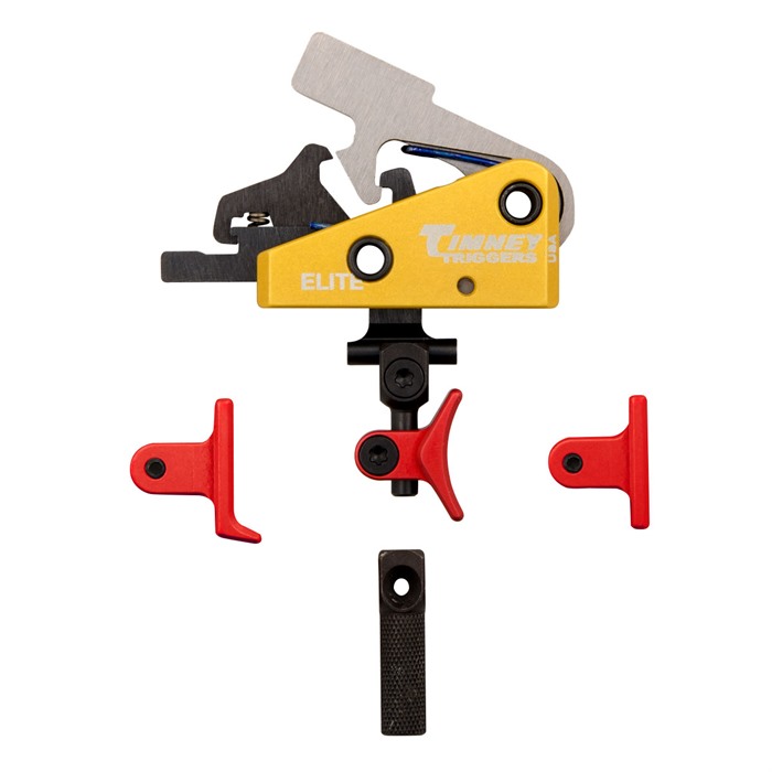 The Timney Calvin Elite Custom replacement trigger for the AR platform features end user customization in a drop-in unit. It maintains an ultra-reliable 5-pound hammer spring coupled with a crisp and zero creep 1.5-pound pull. The reset is remarkably quick and tactile, allowing for rapid and precise follow up shots. The trigger comes with a total of four different shoes that include curved, flat, heeled, and knurled. All necessary tools for fitting and adjusting shoes are included. One key feature of the Calvin Elite AR trigger are the fully-adjustable shoes for a custom fit for every user and application. The shoes are adjustable for length of pull, cast and height for the ultimate in custom comfort and positive contact. Triggers ship standard with red shoes. Trigger has 1.5lb pull weight Includes 4 different trigger shoes