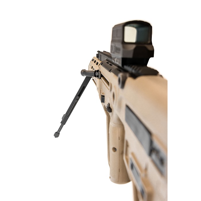 THE MOST RADICAL NEW-CONCEPT BIPOD EVER Balanced. Integrated. Accurate. The BLK LBL Bipod’s innovative barrel-through design allows the rifle to sit ‘in’ the bipod, rather than ‘on’ it, with the center of rotation of the bipod effectively centered on the bore, making it inherently more stable. The result is a balanced rifle without the top-heavy tendencies that can come from large optics. The ball and socket joint provide fluid movement for improved target acquisition and accuracy. With 40 degrees of pan and 15 degrees of cant in each direction, adjusting leg length to level your scope is a thing of the past. BLK LBL was borne out of the question: Why is something as practical as a bipod still an impractical attachment? When not deployed, the legs of the BLK LBL Bipod easily fold to the rear, flush with the hand guard. This means they won’t catch on clothing, gear or branches when you’re on the move, and won’t interfere when shooting off hand, from a barricade, or even when storing your rifle. A Passion for Precision With improved accuracy, lightweight construction, added stability and an expanded range of motion, the BLK LBL Bipod is the new pinnacle of bipod technology. Whether you’re in law enforcement, the armed forces, a sport shooter or hunting in the great outdoors, this bipod gives you exactly what you’re looking for; improved performance. Competitive & Sport Shooters: The BLK LBL Bipod provides improved accuracy and proven stability in all sport shooting competition situations, while the stowed bipod legs won’t interfere when on the move or shooting offhand. Outdoorsmen & Hunters: The integrated design of the folding BLK LBL Bipod means no more catching your bipod legs on heavy brush or branches, your clothes or even your rifle case when stowing. Plus the added stability and accuracy means more precise shots, which means more accurate, more ethical kills. Law Enforcement & Armed Forces: Safety, stability and control. It applies to law enforcement, as well as the BLK LBL Bipod. Of course, improved accuracy means fewer rounds expended, which results in a quicker, safer resolution of situations where protecting citizens and ensuring public safety is of primary importance. Whether it’s the stability only a bipod can provide from a set firing position, or easy handling in close quarters, the integrated design of the BLK LBL Bipod gives soldiers and their fireteam added confidence and effectiveness in nearly any situation. Durable aluminum handguard with the finest integrated bipod available. Made for the IWI X95 We make two lengths, SHORT for 16.5"" barrels, and LONG for 18.5"" barrels. Both the handguard and the legs are longer on the LONG version. SHORT - 209mm/8.2"" long, 478g / 16.8 ounces, Legs extend from 6"" to 9"" LONG - 248mm/9.7"" long, 526g/ 18.5 ounces, Legs extend from 8"" to 11.5"" 40 degrees of Cant rotation