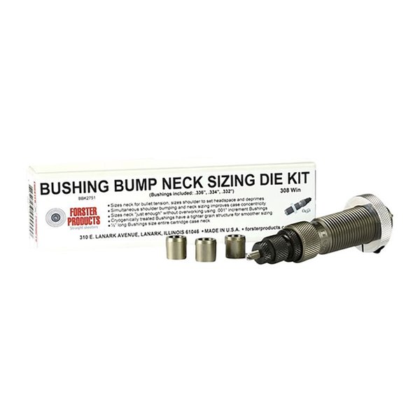 757253991332 Grâce aux kits de dies Bushing Bump Neck de Forster, les rechargeurs de précision peuvent désormais contrôler finement la quantité de tension exercée sur les collets de leurs cartouches. Chacun de ces kits de dies de mise à taille comprend un die de mise à taille poli à la main qui correspond parfaitement au calibre de votre arme à feu, ainsi que trois tailles de bushing sélectionnées à la main par le personnel de Forster. Chacun des bushings est usiné avec précision pour un fini interne lisse. Les calibres disponibles dans les kits de dies Bushing Bump Neck de Forster sont .284 Winchester, 6.8 SPC et 6mm Creedmoor.Délai de livraison environ 14-21 jours.