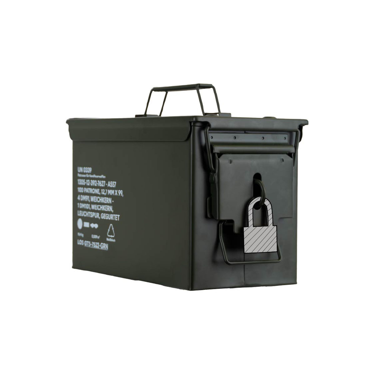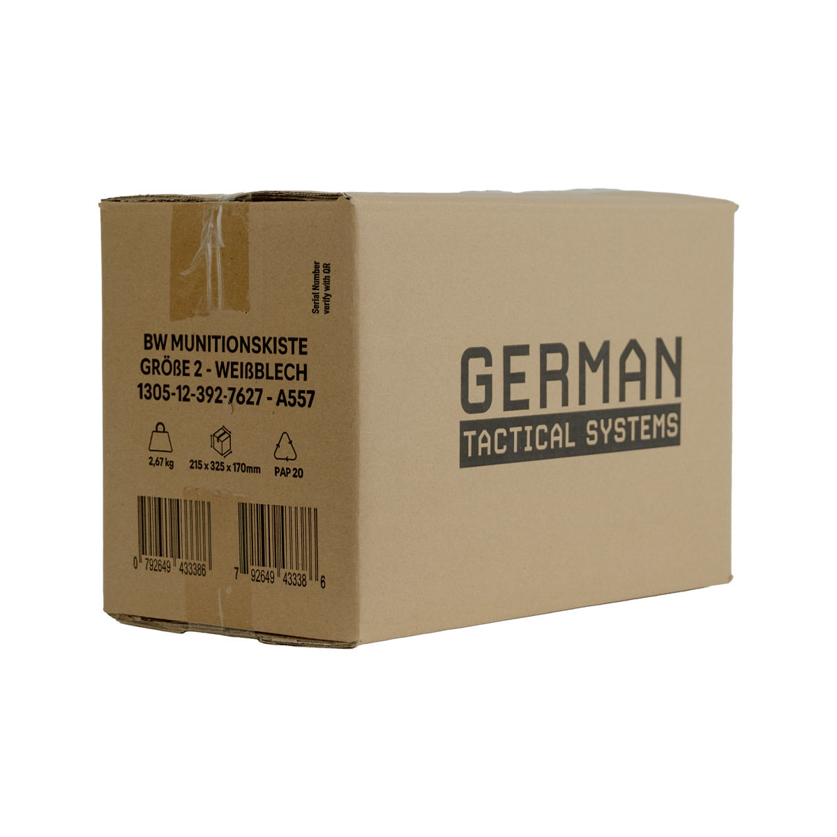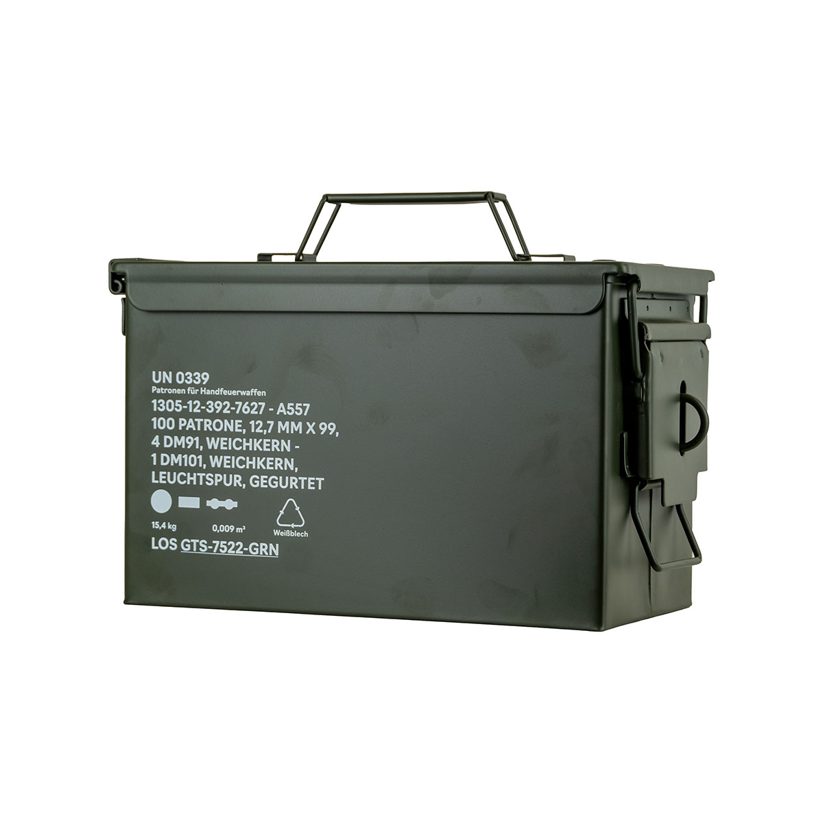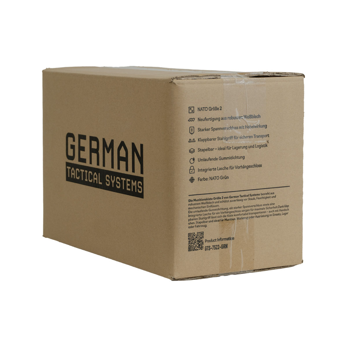 0792649433386 The German Tactical Systems BW Ammo Can (NATO Size 2 (12.7 mm / .50 Cal) is built from rugged tinplate steel, providing dependable protection against dust, moisture, and impacts. Designed for demanding use in the field, during transport, or in storage, it keeps your ammunition and gear secure in any environment. A continuous rubber gasket ensures a tight seal, while the heavy-duty lever-lock latch keeps the lid firmly closed. For extra security, the integrated padlock tab allows you to lock the contents. The foldable steel carry handle makes transport comfortable, even with gloves, and the stackable design is ideal for organized storage and logistics. Key Features: NATO Size 2 (12.7 mm / .50 Cal) – new production from robust tinplate steel Strong lever-lock latch for secure closure Continuous rubber gasket for dust and moisture protection Foldable steel handle for safe, comfortable carrying Integrated padlock tab for added security (lock not included) Stackable design – ideal for storage and transport Color: NATO Green Perfect for storing ammunition, tools, or mission-critical equipment, the GTS BW Ammo Can delivers military-grade reliability for professionals and enthusiasts alike. Pair it with the GTS Gear Dehumidifier to keep contents dry and corrosion-free for long-term storage.Délai de livraison environ 3-6 jours.