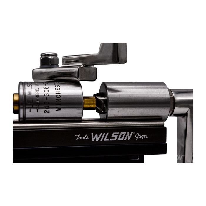 815145027733 Kit de Micro Réglage pour Coupe-Cartouches Wilson - Comprend un support, un serre-joint et le célèbre coupe-cartouches Wilson. En production depuis 1936. Les porte-cartouches sont vendus séparément. Coupe les cartouches de .17 à .45 calibre. Fini en acier inoxydable avec un revêtement TiN durable et réglage micrométrique. Revêtu d'oxyde noir pour une finition durable. NOUVEAU : Poignée en acier inoxydable 304 incluse avec le coupe-cartouches micrométrique. Fabriqué aux États-Unis avec de l'acier américain.En rupture de stock, environ 4-12 semaines à partir de l'entrepôt principal.
