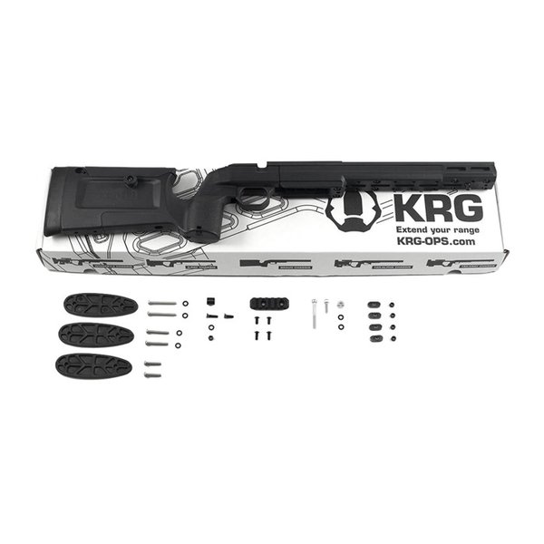 - Le dos en aluminium rigide sur toute la longueur empêche la flexion de la crosse avant, tout en permettant une modularité de conception avec de nombreux accessoires et même d'autres châssis KRG.