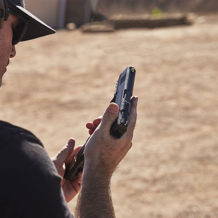- Arrêt de glissière ambidextre usiné en une seule pièce et bouton de libération de chargeur réversible pour une ergonomie supérieure