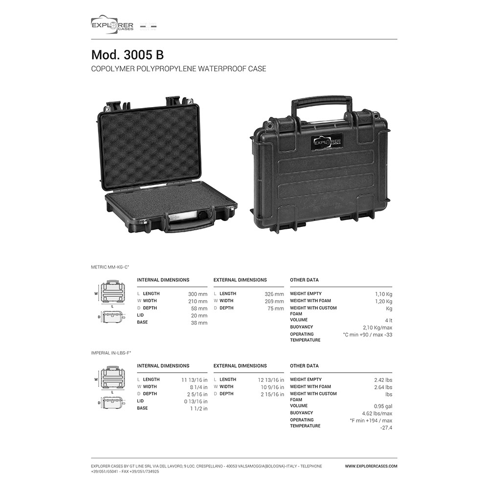 8024482181547 La meilleure protection pour votre précieux bébé - Le caisson d'arme ultime avec une variété de fonctions de la plus haute qualité, fabriqué par Explorer Cases en Italie. Caractéristiques : Longueur : 326mm (300mm à l'intérieur) Largeur : 269mm (210mm à l'intérieur) Profondeur : 75mm (58mm à l'intérieur) Poids : 1,20kg (1,10kg poids à vide sans insert) Couleur : Noir Insert : Pre-Cube Foam Littéralement indestructible Les caissons d'arme d'Explorer Cases sont équipés de charnières métalliques résistantes à la corrosion avec des fonctionnalités de maintien du couvercle, qui fixent le couvercle et le maintiennent en place lorsqu'il est ouvert. Ainsi, vous pouvez être assuré que vos caissons d'arme vous accompagneront longtemps. Grâce aux loquets de verrouillage, les caissons d'arme sont toujours hautement sécurisés. Le joint O-ring les rend également résistants à l'eau dans une grande mesure. Chaque caisson d'arme est équipé d'une valve de décharge de pression manuelle. Vous pouvez donc vous détendre et n'aurez aucun problème à manipuler et fermer le caisson. Exactement comme vous le souhaitez Les caissons sont fournis avec des découpes internes pour des supports internes optionnels ou des anneaux de montage, vous permettant de ranger tout exactement comme cela convient le mieux à vos besoins. Chaque valise est livrée avec une étiquette amovible étanche que vous pouvez utiliser pour étiqueter votre équipement ou stocker vos données. Le caisson peut être transporté traditionnellement via la grande poignée avant ou via des sangles d'épaule optionnelles, qui peuvent être facilement fixées à n'importe quel modèle. La série 3005 est optimisée pour le transport en avion.En réapprovisionnement, livraison du fabricant en retard.