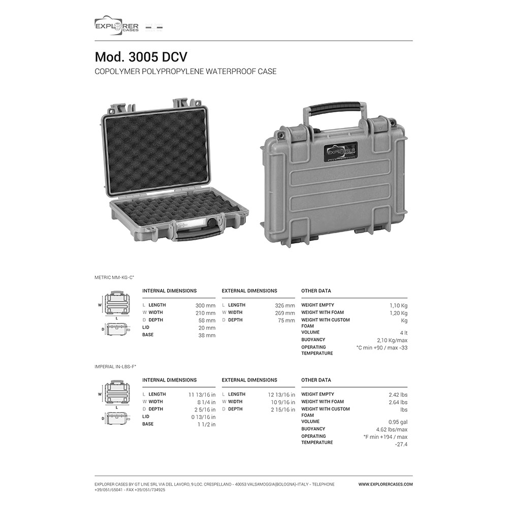 8024482182377 La meilleure protection pour votre précieux bébé - L'étui ultime pour arme avec une variété de fonctions de la plus haute qualité, fabriqué par Explorer Cases en Italie. Caractéristiques : Longueur : 326mm (300mm à l'intérieur) Largeur : 269mm (210mm à l'intérieur) Profondeur : 75mm (58mm à l'intérieur) Poids : 1,20kg (1,10kg poids à vide sans insert) Couleur : Noir Insert : Mousse convolutée Littéralement indestructible Les étuis pour armes d'Explorer Cases sont équipés de charnières métalliques résistantes à la corrosion avec des dispositifs de maintien du couvercle, qui fixent le couvercle et le maintiennent en place lorsqu'il est ouvert. Vous pouvez donc être assuré que vos étuis pour armes vous accompagneront pendant très longtemps. Grâce aux verrous de sécurité, les étuis pour armes sont toujours hautement sécurisés. Le joint en O-ring les rend également très résistants à l'eau. Chaque étui pour arme est équipé d'une valve de décharge de pression manuelle. Vous pouvez donc être tranquille et n'aurez aucun problème à manipuler et fermer l'étui. Exactement comme vous le souhaitez Les étuis sont fournis avec des découpes internes pour des supports internes optionnels ou des anneaux de montage, afin que vous puissiez ranger tout exactement comme cela convient le mieux à vos besoins. Chaque valise est livrée avec une étiquette amovible étanche que vous pouvez utiliser pour étiqueter votre équipement ou stocker vos données. L'étui peut être transporté de manière traditionnelle via la grande poignée avant ou via des sangles d'épaule optionnelles, qui peuvent être facilement fixées à n'importe quel modèle. La série 3005 est optimisée pour le transport en avion.En réapprovisionnement, livraison du fabricant en retard.