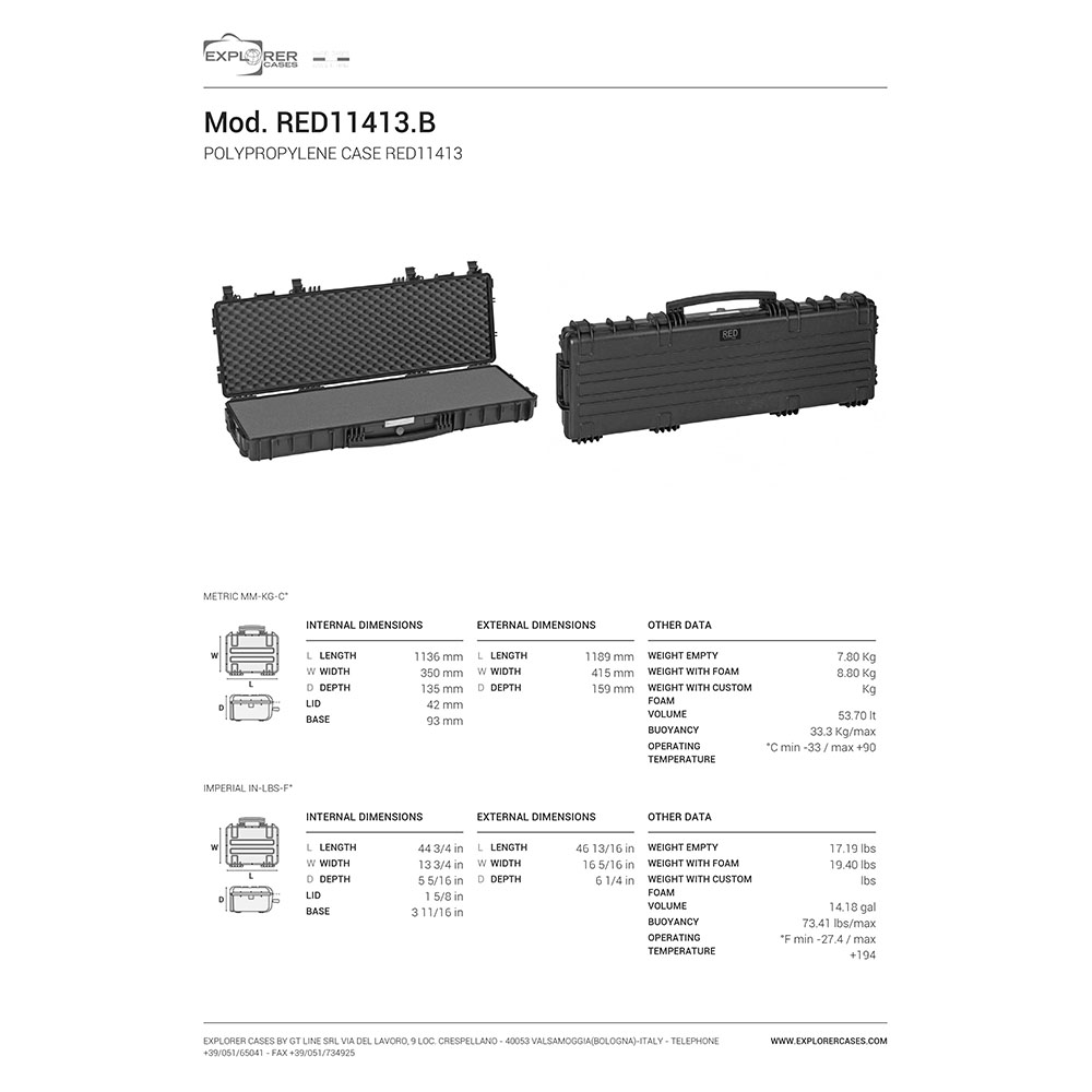 8024482182872 La meilleure protection pour votre précieux bébé - Le boîtier d'arme ultime avec une variété de fonctions de la plus haute qualité, fabriqué par Explorer Cases en Italie. Caractéristiques : Longueur : 1189mm (1136mm à l'intérieur) Largeur : 415mm (350mm à l'intérieur) Profondeur : 159mm (135mm à l'intérieur) Poids : 8,80kg (7,80kg sans insert) Couleur : Noir Insert : Pre-Cube Foam Littéralement indestructible Les boîtiers d'arme d'Explorer Cases sont équipés de charnières en métal anticorrosion avec des dispositifs de maintien du couvercle, qui fixent le couvercle et le maintiennent en place lorsqu'il est ouvert. Vous pouvez donc être assuré que vos boîtiers d'arme vous serviront pendant très longtemps. Grâce aux loquets de verrouillage, les boîtiers d'arme sont toujours hautement sécurisés. Le joint en O-ring les rend également résistants à l'eau dans une large mesure. Chaque boîtier d'arme est équipé d'une valve de décharge de pression manuelle. Vous pouvez donc vous détendre et n'aurez aucun problème à manipuler et fermer le boîtier. Exactement comme vous le souhaitez Les boîtiers sont dotés de découpes internes pour des supports internes ou des anneaux de montage optionnels, afin que vous puissiez ranger tout exactement comme cela convient le mieux à vos besoins. Chaque valise est livrée avec une étiquette amovible étanche sur laquelle vous pouvez étiqueter votre équipement ou stocker vos données. Le boîtier peut être transporté de manière traditionnelle via la grande poignée avant ou via des sangles d'épaule optionnelles, qui peuvent être facilement attachées à n'importe quel modèle. La série Mod Red 11413 peut également être utilisée comme valise à roulettes.Délai de livraison environ 3-6 jours.