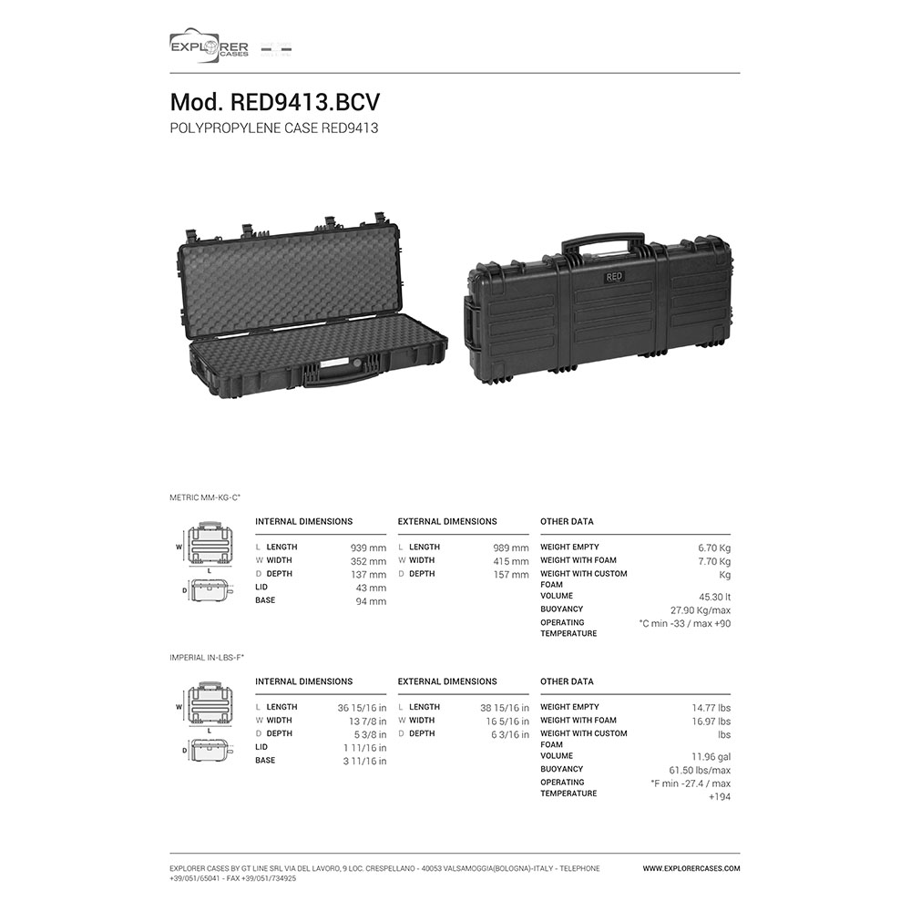 8024482183015 La meilleure protection pour votre précieux bébé - Le meilleur étui pour armes avec une variété de fonctions de la plus haute qualité, fabriqué par Explorer Cases en Italie. Caractéristiques : Longueur : 989mm (939mm à l'intérieur) Largeur : 415mm (352mm à l'intérieur) Profondeur : 157mm (137mm à l'intérieur) Poids : 7,70kg (6,70kg sans rembourrage) Couleur : Noir Rembourrage : Mousse Convolutée Littéralement indestructible Les étuis pour armes d'Explorer Cases sont équipés de charnières métalliques résistantes à la corrosion avec des dispositifs de maintien de couvercle, qui fixent le couvercle et le maintiennent en place lorsqu'il est ouvert. Vous pouvez donc être assuré que vos étuis pour armes vous serviront pendant très longtemps. Grâce aux fermetures à loquet, les étuis pour armes sont toujours très sécurisés. Le joint en O les rend également résistants à l'eau dans une grande mesure. Chaque étui pour armes est équipé d'une valve de décharge de pression manuelle. Vous pouvez donc vous détendre et n'aurez aucun problème à manipuler et fermer l'étui. Exactement comme vous le souhaitez Les étuis sont fournis avec des découpes internes pour des supports internes ou des anneaux de montage optionnels, afin que vous puissiez ranger tout exactement comme cela convient le mieux à vos besoins. Chaque valise est livrée avec une étiquette amovible étanche sur laquelle vous pouvez étiqueter votre équipement ou stocker vos données. L'étui peut être transporté de manière traditionnelle via la grande poignée avant ou via des sangles d'épaule optionnelles, qui peuvent être facilement attachées à n'importe quel modèle. La série Mod Red 9413 peut également être utilisée comme valise à roulettes.