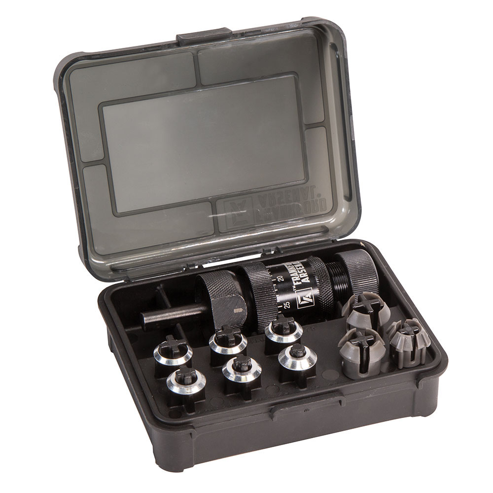 661120416746 • Système de collet réglable fonctionnant avec tous les étuis à gorge, du .17 Remington au .460 Weatherby • Compatible avec presque toutes les perceuses de 1/2" ou perceuses à colonne • Cutter en acier inoxydable durci à grande vitesse qui restera affûté pendant des milliers de cartouches • Micro-réglable • Système de coupe universel qui s'aligne sur les épaules des étuis pour un taillage précis à chaque fois - comprend une mallette de rangement pour les collets et les colliersEn réapprovisionnement, livraison du fabricant en retard.