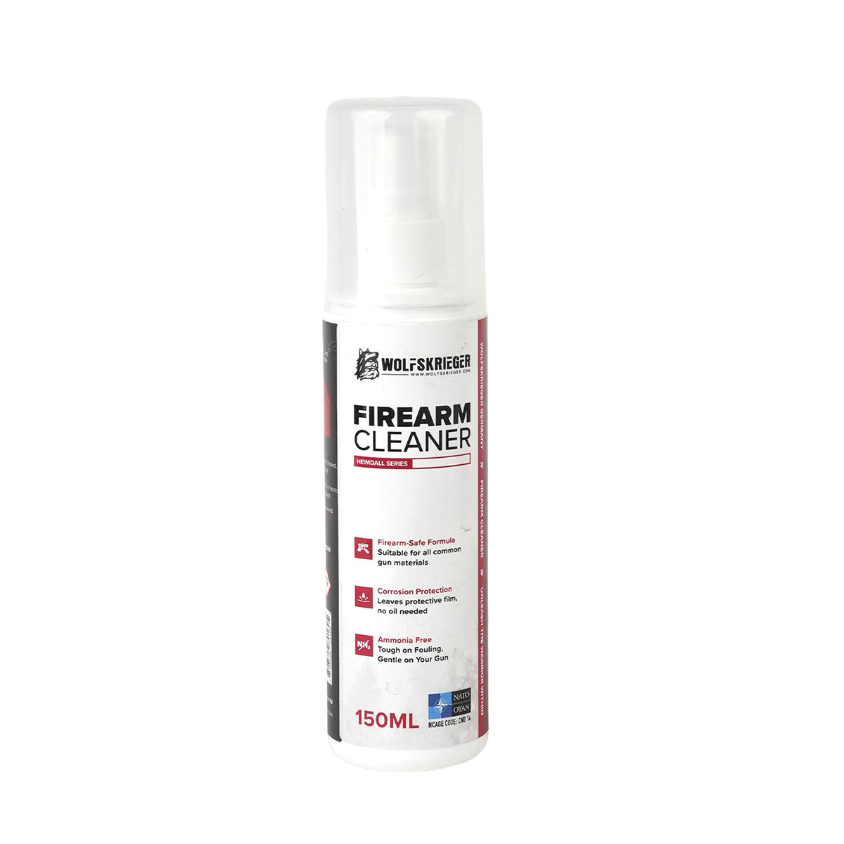 726529841695 The Wolfskrieger Firearm Cleaner is a versatile, finish-safe cleaning spray developed for fast and effective firearm maintenance. Designed to remove carbon, powder residue, grease, and contaminants from all firearm components, it delivers thorough cleaning performance while remaining gentle on materials and surfaces. Its active formula penetrates tight tolerances and hard-to-reach areas, lifting fouling without the need for aggressive scrubbing or abrasive action. At the same time, it preserves coatings and finishes, making it an ideal choice for routine cleaning as well as detailed maintenance sessions. Unlike harsh ammonia-based solvents, Wolfskrieger Firearm Cleaner is ammonia-free and low-odor, making it safe for indoor use and more comfortable to handle. The formula is also non-flammable and biodegradable, combining strong cleaning power with a modern, user-friendly approach. After application, the cleaner leaves behind a light protective finish that helps guard against corrosion, ensuring reliable performance and protection even between sessions. Built for shooters who want effective cleaning without compromising their equipment, Wolfskrieger Firearm Cleaner delivers dependable results in a compact, ready-to-use solution.