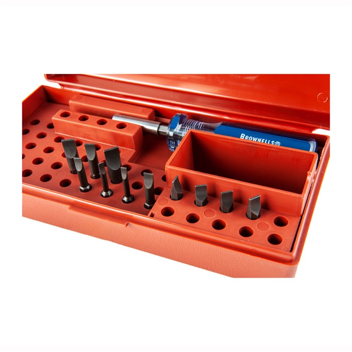 BROWNELLS STANDARD MAGNA-TIP SETS The Brownells Standard Magna-Tip® Sets are meticulously designed to meet the diverse needs of gunsmiths and firearm enthusiasts, offering a comprehensive selection of interchangeable bits and handles for precise firearm maintenance and assembly. Key Features: Comprehensive Bit Selection: Each set includes eleven bits for slotted screws, #1, #2, and #3 Phillips bits, plus ten hex bits for socket head screws, ensuring versatility across various firearm applications. True Hollow-Ground Bits: The Magna-Tip® bits feature true hollow-ground tips that transmit torque evenly and smoothly up the shank, providing complete metal-to-metal contact with the screw slot. This design allows maximum power to be exerted without damaging the screw. Durable Construction: Manufactured from high-quality materials, these bits are built to withstand rigorous use, ensuring long-lasting performance. Ergonomic Handle Design: The handle is made from shockproof plastic with grooved flutes for a positive grip, allowing for comfortable and controlled use during firearm maintenance tasks. Shockproof plastic with grooved flutes Specifications: #1 Standard Kit Includes the Magna-Tip handle of your choice. 24 bits. 11 slotted, 3 Phillips, & 10 hex bits. Includes the box and tray for organized storage and easy access. #2 Standard Kit Includes the Magna-Tip handle of your choice. 24 bits. 11 slotted, 3 Phillips, & 10 hex bits. #3 Standard Kit Includes the Magna-Tip handle of your choice. 11 slotted bits. Included the box and tray for organized storage and easy access. Customer Insights: Our customers appreciate the Brownells Standard Magna-Tip® Sets for their versatility and precision. The comprehensive selection of bits allows Customers to tackle a wide range of firearm maintenance tasks with confidence. The true hollow-ground design ensures a secure fit in screw slots, minimizing the risk of damage during use.The durable construction and ergonomic handle design contribute to a comfortable and reliable user experience, making these sets a valuable addition to any gunsmith's toolkit. Incorporating the Brownells Standard Magna-Tip® Set into your firearm maintenance routine ensures you have the right tools to perform tasks with precision and confidence. Their specialized design and robust construction make them essential for achieving professional results in gunsmithing.