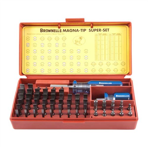 Every gunsmith knows no two screw slots are ever exactly the same. Because so many factories use outside vendors for screws, slot sizes can vary, even within the same model of gun. If you want to be professional about your work, you custom grind each bit to the correct size, a frustrating and time-consuming task without a Super Set. Magna-Tip Bits feature TRUE hollow-ground bits which transmit all the energy of torque evenly and smoothly, up the shank of the bit. Not only does hollow grinding permit this power transfer, it also gives complete metal-to-metal contact between the tip of the bit and the entire screw slot. Thus, maximum power can be exerted. The 58 Bit Master Super Set Plus adds 10 hex-head bits (#185-9, #185-10, #185-00, #185-0, #185-1, #185-2, #185-3, #185-4, #185-5, #185-6), 3 Phillips-head bits (#440-1, #440-2, #440-0), and a 1/8"" square bit for Remington buttplates to the contents of the 44 Bit Super Set Plus. It's the most incredible screwdriver system you will ever use!