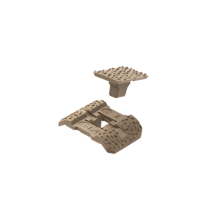 M-LOK Type 2 Half Slot Rail Covers are low-profile, two-piece covers that install directly onto most full and half size M-LOK aluminum hand guards (non-polymer). Designed to work in conjunction with full size M-LOK Type 2 Rail Covers, Half Slot Rail Covers can be used to fill extra space left by full size Rail Covers and other accessories—allowing for more customization and coverage of your hand guard. M-LOK Type 2 Half Slot Rail Covers are non-orientation specific, which allows the user to mount them in any direction desired without affecting function. They feature beveled contours to minimize potential snagging, our TSP texture for additional grip, and a low profile that’s only slightly more than 1/8” from the mounting surface. The center locking tab is pre-scored to allow the user to snap off sections and mix and match colors for a customized look. Includes four panels, each covering half of an M-LOK slot. Not compatible with MAGPUL MOE M-LOK, MOE SL and SGA fore-ends, and may not be compatible with free-float handguards that have a wider and flatter profile, as they will not seat deep enough to allow the center portion to lock in. Made in the USA. Non-orientation specific, can be mounted in any direction desired Beveled contours minimize potential snagging TSP texture creates additional grip Covers barely protrude more than 1/8” above the rail surface to maintain a low-profile Can be mixed and matched with various colors for a custom look Installed or uninstalled in seconds