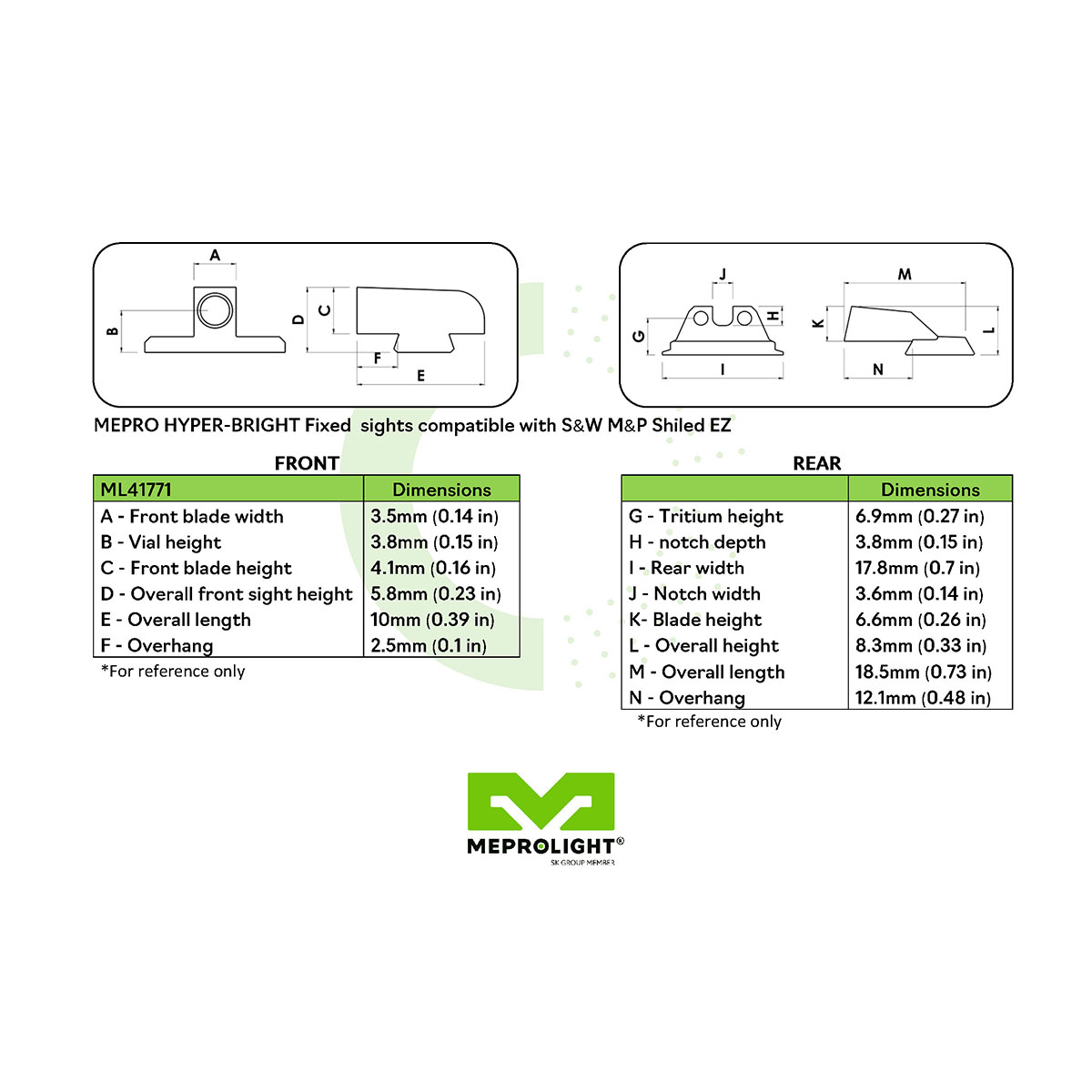 Lastly, our Mepro HYPER-BRIGHT sights require no batteries. They are always on, always ready, 24 hours a day, 7 days a week, 365 days a year. Tritium illuminance is guaranteed for 12 years. They are maintenance-free and can be installed directly with no modifications to your factory slide.
