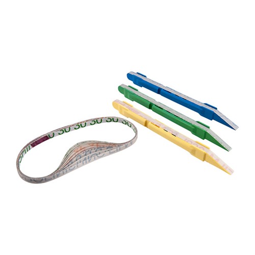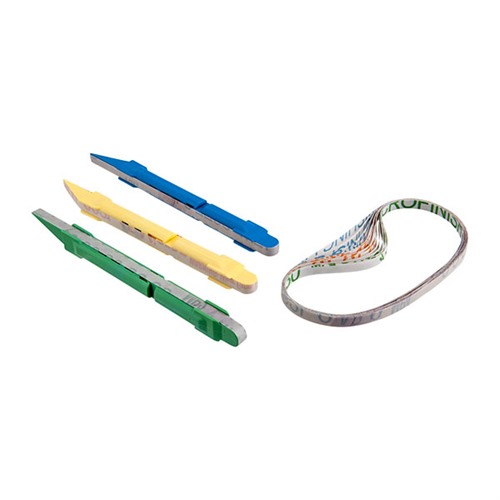 Le film micro-finition 3M est un abrasif à coupe rapide pour une finition précise, uniforme et à tolérance rapprochée. Le support en film polyester haute résistance et la résine minérale en oxyde d'aluminium classée en microns sont liés pour une durabilité accrue. Ce matériau est idéal pour l'armurerie, la fabrication de bijoux, la réparation de montres et les dispositifs médicaux. Ce matériau fonctionne bien sur le métal et le plastique. Chaque kit contient 3 detailers de ponçage ainsi que 15 ceintures de film micro-finition ; 5 ceintures de 3 grains différents. Le detailer de ponçage est parfait pour finir les zones difficiles d'accès. La ceinture abrasive peut être indexée. Le detailer de ponçage est à ressort pour exercer une tension sur la ceinture abrasive. Après l'utilisation de la ceinture abrasive, il suffit de comprimer l'outil et de remplacer la ceinture abrasive par une nouvelle. Elles sont codées par couleur pour une identification facile du grain. Noir : 60 Microns, 220 Grit Gris : 50 Microns, 270 Grit Rouge : 40 Microns, 320 Grit Vert : 30 Microns, 400 Grit Jaune : 15 Microns, 600 Grit Bleu : 9 Microns, 1200 GritSupprimé du programme