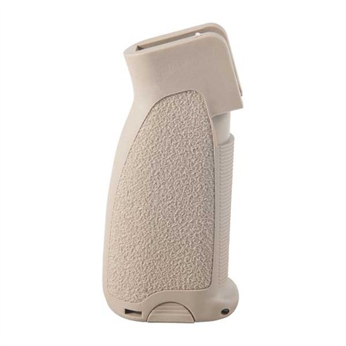 Reduced angle, ergonomically enhanced grips are designed to improve rifle control for shooters preferring the modern, “squared off” stance. Constructed of durable, impact-resistant polymer, they feature a texturized surface for a sure-hold and a water-resistant, hinged door that opens to reveal a small compartment capable of storing batteries or other small items. Two included modular triggerguard inserts (smooth and extended) may be used to close the gap between the triggerguard and grip depending on your preference; inserts also work well on rifles with larger triggerguards. MOD-0 model is similar in size to the standard A1/A2-style grip.