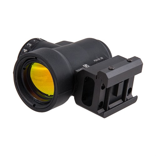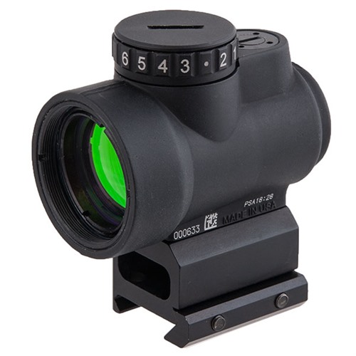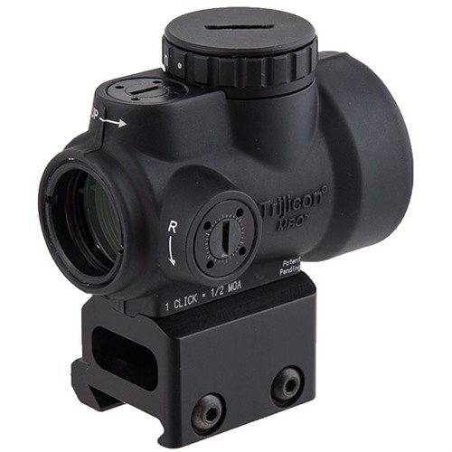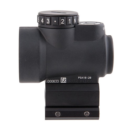The Trijicon MRO™ (Miniature Rifle Optic) is a sealed miniature reflex sight intended for use on rifles, carbines and shotguns to provide fast target acquisition. The large aperture and tapered light path maximizes the viewing area and allows for better situational awareness and fast target engagement – especially from non-standard shooting positions. Combine all this with the ambidextrous brightness controls, sub-flush adjusters, advanced lens coatings and the fully sealed, waterproof, hard anodized forged 7075-T6 housing and you have the ultimate mini reflex sight on the market. The front, or objective lens is installed at a precise angle in order to reflect the red dot back to the user's eye.