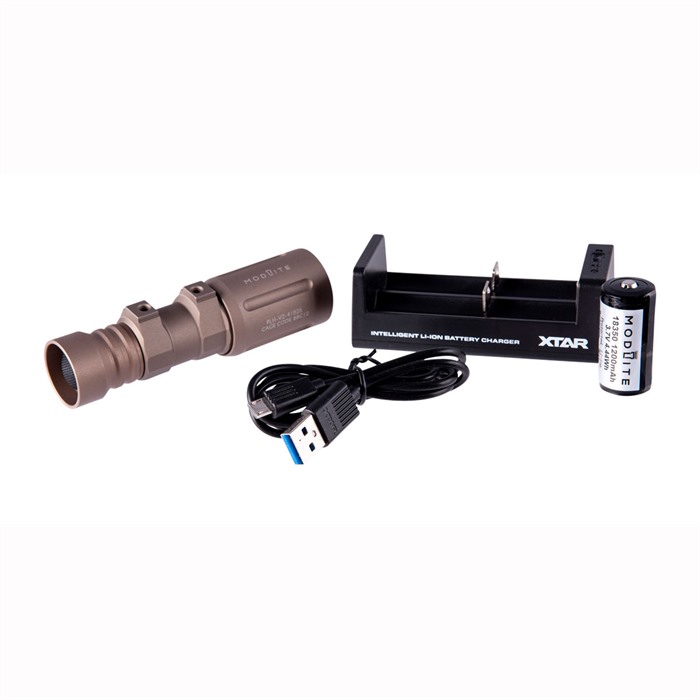 This Modlite PLHv2 18350 weapon light package contains a PLHv2-light head, 18350 body and the option of a tail cap or without a tail cap. It also includes a single KeepPower 1200mAh 18350 battery and a XTAR MC2 charger. Item 100-042-502 does not include a tail cap or charger to offer a savings for those who don't need those components. This light is a large step forward from the PLHv1 light. Lumen output is about the same, but throw is greatly improved. It is the best balance of flood and throw available. If you are looking for the best overall output and throw this is the package you want. Features Cool White 5700K emitter tint Made and assembled in the USA Drivers are fully potted and tested to withstand select fire SCAR 17 recoil. Lifetime guarantee Approximately 1350 out the front lumens and candela is approximately 54,000. It is an excellent overall light head good for indoor or outdoor use. 6061 Series Alum bezel with Mil-Spec Hard Anodizing. Ultra clear BOROFLOAT® lens allows 98-99% light transmittance. Lithium CR123 cells are not supported and if used will cause the cells to heat up and possibly explode or catch fire. We recommend the KeepPower 18350 high drain cells which can be found separately. Runtime is about 35 minutes with the supplied 18350 cells.
