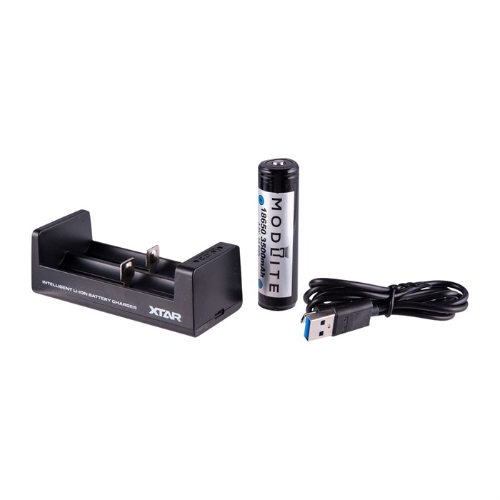 This Modlite PLHv2 18650 weapon light package contains a PLHv2-light head, 18650 body and the option of a tail cap or without a tail cap. It also includes a single KeepPower 3500mAh 18650 battery and a XTAR MC2 charger. (Item 100-042-503 does not include a tail cap or charger) This light is a large step forward from the PLHv1 light. Lumen output is about the same, but throw is greatly improved. It is the best balance of flood and throw available. If you are looking for the best overall output and throw this is the package you want. Features Cool White 5700K emitter tint Made and assembled in the USA Drivers are fully potted and tested to withstand select fire SCAR 17 recoil. Lifetime guarantee Approximately 1350 out the front lumens and candela is approximately 54,000. It is an excellent overall light head good for indoor or outdoor use. 6061 Series Alum bezel with Mil-Spec Hard Anodizing. Ultra clear BOROFLOAT® lens allows 98-99% light transmittance. Lithium CR123 cells are not supported and if used will cause the cells to heat up and possibly explode or catch fire. Modlite recommends the KeepPower 18650 high drain cells. Runtime is about 75 minutes with the supplied 18650 cells.
