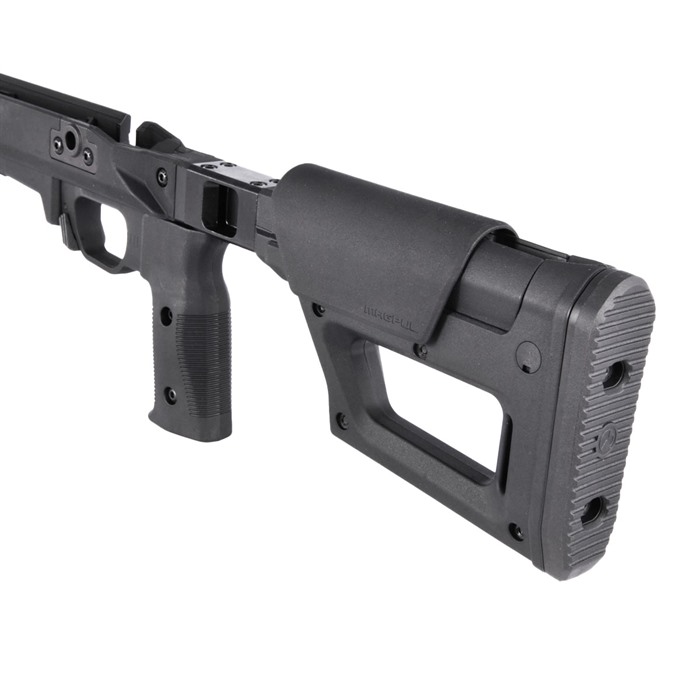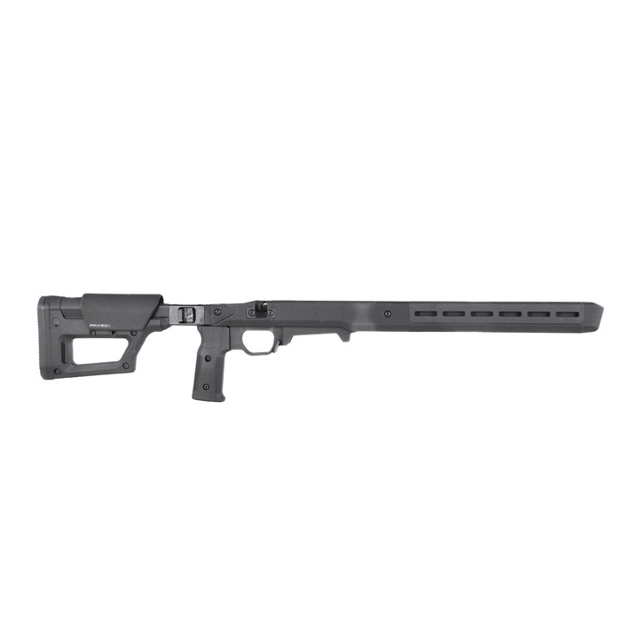 Maintaining the most important features of Magpul’s original Pro 700L, the Pro 700L Lite strikes a balance between features and cost without sacrificing performance. As the name suggests, the Pro 700L Lite blends the original Pro 700L Chassis and the PRS Lite stock to create a simplified rear end with a strong foundation – passing on the value and weight savings to you. The streamlined design weighs in at 4.5 pounds, a full pound less than its predecessor, but still packs a complete set of features that elevate your rifle’s performance. The Pro 700L Lite provides an optimized shooter interface with 0.8” of comb height and 1.4” of LOP adjustments (LOP measures 13.0” -14.4”). The low-profile rubber butt-pad is adjustable for height and cant, providing an extremely stable interface with the shooter’s shoulder. Sling attachment options include an ambidextrous 1.25” footman’s loop, a reversible QD sling swivel cup, and space for another optional QD sling swivel cup. The injection-molded polymer grip has a 5-degree forward edge sweep and enlarged palm swell with a 7-degree aft edge sweep for enhanced user comfort, and it includes a .75” fore/ aft adjustment range using a common hex wrench. An additional grip is included, offering a more aggressive sweep and enlarged palm swell for the shooter who is more inclined to a less vertical grip interface (8-degree forward / 20-degree aft edge sweep). The Pro 700L Lite surrounds its billet-aluminum chassis with Magpul polymer for enhanced ergonomics, strength, and sound mitigation. Built around the user, it is fully ambidextrous at the swap of a bolt retainer plate, and the vertical grip can be adjusted for various trigger reaches. The included large trigger guard can accommodate usage with gloves and aftermarket triggers. The AICS-pattern magazine well features an ambidextrous mag release and has a front barricade stop to prevent the rifle from resting on the magazine when using barricade support. Up front, there are numerous M-LOK slots (left-6 / right-6 / bottom-7) allowing you to mount whatever accessories your loadout calls for. Extremely versatile and adaptable, the Pro 700L Lite turns your long action, 700-pattern rifle into the perfect bolt action precision machine. FEATURES Fully machined aluminum fore end and bedding block AICS compatible bottom metal Vertical grip with adjustment for trigger reach Large trigger guard accommodates gloves and aftermarket triggers Compatible with left and right-handed actions Comb height, LOP, and butt pad adjustment from PRS Lite Injection-molded polymer grip with 5-degree forward edge sweep and enlarged palm swell with 7-degree aft edge sweep for enhanced user comfort combined with a .75” fore/aft adjustment range using a common hex wrench Additional grip option included with a more aggressive sweep and enlarged palm swell for the shooter that is more inclined to a less vertical grip interface (8 degree forward / 20-degree aft edge sweep) Multiple sling attachment points (an ambidextrous 1.25” footman’s loop, a reversible QD sling swivel cup, and a space for another optional QD sling swivel cup Made in the USA COMPATIBILITY Compatible with Remington® 700 Long Action and other Remington 700 Long Action footprints. Buttstock/cheek riser must be removed on the Pro 700L Lite before the user can remove the bolt from the action. Ships with MAG698 (Magnum Long Action AICS 5-round PMAG)