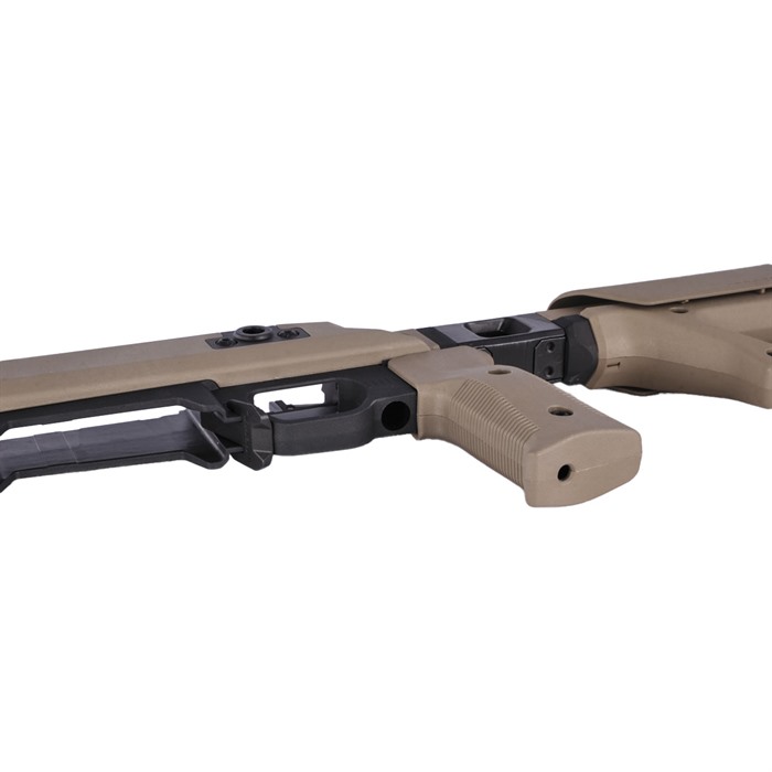 Maintaining the most important features of Magpul’s original Pro 700L, the Pro 700L Lite strikes a balance between features and cost without sacrificing performance. As the name suggests, the Pro 700L Lite blends the original Pro 700L Chassis and the PRS Lite stock to create a simplified rear end with a strong foundation – passing on the value and weight savings to you. The streamlined design weighs in at 4.5 pounds, a full pound less than its predecessor, but still packs a complete set of features that elevate your rifle’s performance. The Pro 700L Lite provides an optimized shooter interface with 0.8” of comb height and 1.4” of LOP adjustments (LOP measures 13.0” -14.4”). The low-profile rubber butt-pad is adjustable for height and cant, providing an extremely stable interface with the shooter’s shoulder. Sling attachment options include an ambidextrous 1.25” footman’s loop, a reversible QD sling swivel cup, and space for another optional QD sling swivel cup. The injection-molded polymer grip has a 5-degree forward edge sweep and enlarged palm swell with a 7-degree aft edge sweep for enhanced user comfort, and it includes a .75” fore/ aft adjustment range using a common hex wrench. An additional grip is included, offering a more aggressive sweep and enlarged palm swell for the shooter who is more inclined to a less vertical grip interface (8-degree forward / 20-degree aft edge sweep). The Pro 700L Lite surrounds its billet-aluminum chassis with Magpul polymer for enhanced ergonomics, strength, and sound mitigation. Built around the user, it is fully ambidextrous at the swap of a bolt retainer plate, and the vertical grip can be adjusted for various trigger reaches. The included large trigger guard can accommodate usage with gloves and aftermarket triggers. The AICS-pattern magazine well features an ambidextrous mag release and has a front barricade stop to prevent the rifle from resting on the magazine when using barricade support. Up front, there are numerous M-LOK slots (left-6 / right-6 / bottom-7) allowing you to mount whatever accessories your loadout calls for. Extremely versatile and adaptable, the Pro 700L Lite turns your long action, 700-pattern rifle into the perfect bolt action precision machine. FEATURES Fully machined aluminum fore end and bedding block AICS compatible bottom metal Vertical grip with adjustment for trigger reach Large trigger guard accommodates gloves and aftermarket triggers Compatible with left and right-handed actions Comb height, LOP, and butt pad adjustment from PRS Lite Injection-molded polymer grip with 5-degree forward edge sweep and enlarged palm swell with 7-degree aft edge sweep for enhanced user comfort combined with a .75” fore/aft adjustment range using a common hex wrench Additional grip option included with a more aggressive sweep and enlarged palm swell for the shooter that is more inclined to a less vertical grip interface (8 degree forward / 20-degree aft edge sweep) Multiple sling attachment points (an ambidextrous 1.25” footman’s loop, a reversible QD sling swivel cup, and a space for another optional QD sling swivel cup Made in the USA COMPATIBILITY Compatible with Remington® 700 Long Action and other Remington 700 Long Action footprints. Buttstock/cheek riser must be removed on the Pro 700L Lite before the user can remove the bolt from the action. Ships with MAG698 (Magnum Long Action AICS 5-round PMAG)