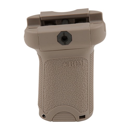 Polymer vertical grip attaches to Picatinny rail to help improve weapon handling and control. Cross-bolt design allows installation with field expedient tools, like coin or cartridge rim, and mounting clamps are reversible. Short grip won't snap on slings and gear, and forward angle gives more natural wrist position. Texture and ridges give superior grip, and storage compartment holds spare batteries or other accessories. Available in black or Flat Dark Earth.