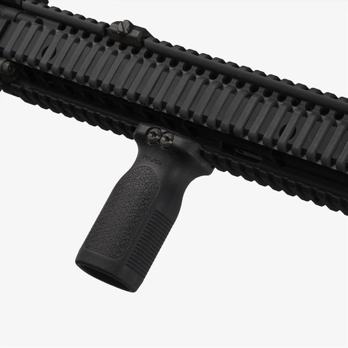 Les serrations horizontales agressives à l'avant et à l'arrière, ainsi que le texturage craquelé sur les côtés, garantissent une prise sécurisée dans toutes les conditions météorologiques. La RVG™ (Rail Vertical Grip) combine les caractéristiques ergonomiques du MVG avec un système de fixation Picatinny conventionnel, permettant une utilisation sur des garde-main raillés standards. Un adaptateur est inclus pour permettre l'installation sur de nombreux avant-bras non-raillés également.