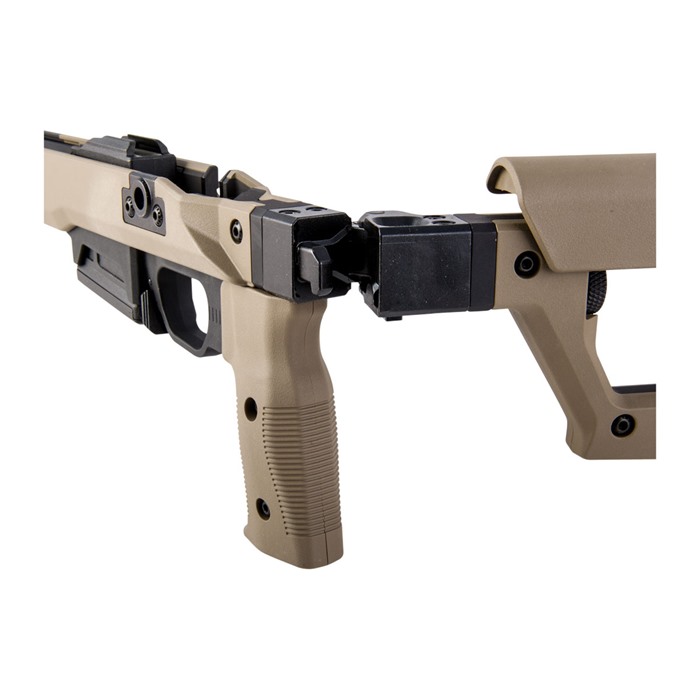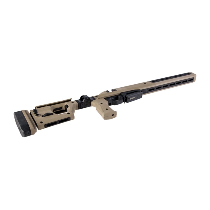 - Châssis entièrement ambidextre avec un plateau de découpe pour boulon interchangeable, un appui-joue réversible et une charnière réversible.