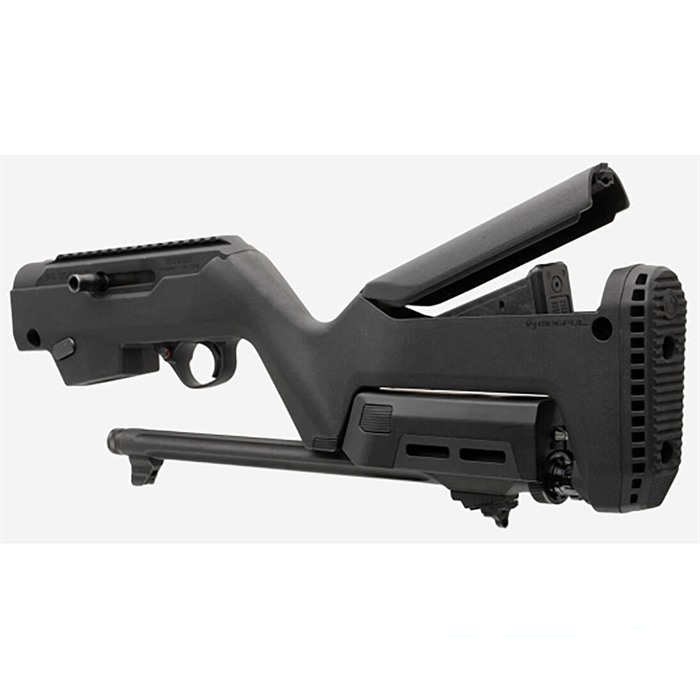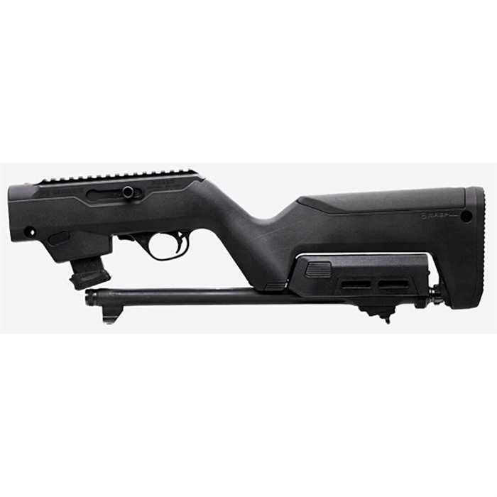When the Backpacker Stock first emerged for the popular Ruger 10/22®, enthusiasts flocked to the streamlined design that made takedown models of the 10/22 easy to carry. Now, that same functionality is available to owners of the Ruger PC Carbine®, which operates with the same quick-takedown mechanism as the 10/22. This Magpul Backpacker Stock provides ultimate portability and provides many of the same features found in the original X-22 Backpacker. You'll find the same interface that locks the two separate halves of the gun together for transport and storage, and there are M-LOK attachment slots on the forend that make adding accessories a breeze. Ruger® models equipped with chassis and/or tubular handguards utilize a Modular Handguard Mount which will need to be replaced by the end user with a standard Takedown Block in order to mount the Magpul Forend. Each Magpul PC Carbine® Backpacker Stock includes two storage locations, one found in the water-resistant grip and the other in the cheek riser that accommodates storage for a single pistol magazine. The size of this rear compartment will accommodate magazines up to the size of Magpul's PMA 21 GL9. This drop-in stock fit is designed to work with PC Carbines chambered in 9mm and .40 S&W, and there are interchangeable cheek risers that will work for mounted optics. A non-slip rubber butt pad ensures shooting comfort, and you can add an additional 3/8-inch insert to adjust the length-of-pull.