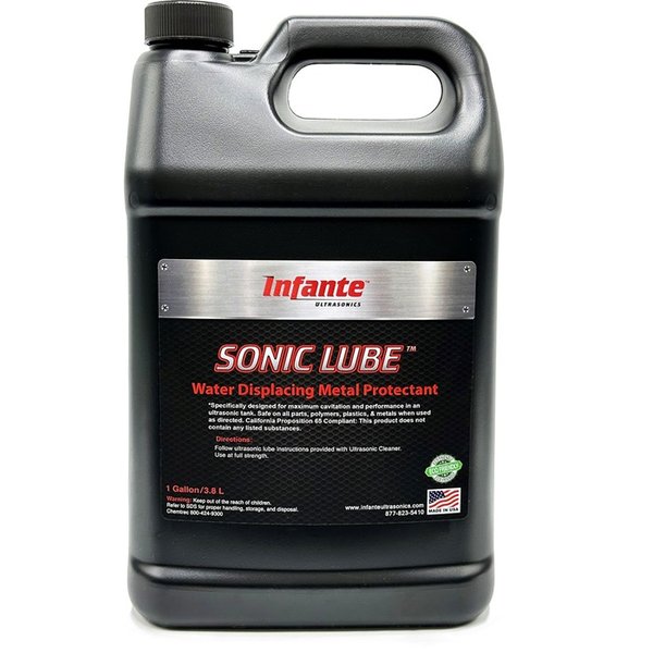 Infante’s Sonic Lube is a highly engineered Prop.65 compliant formulation specifically designed for use in the ultrasonic tank for water displacement, parts protection for firearms and other metal parts and rust prevention. It’s used full strength after the water based ultrasonic cleaning process, ensuring that the parts are moisture free and protected. The low surface tension and viscosity of the Sonic Lube allows it to penetrate firearm parts using ultrasonic energy to emulsify water and evaporate it out of the solution, leaving a factory new protective coating on the parts. The Sonic Lube has a low odor, is compatible with all metals and plastics, and is non-hazardous. Use at full strength. Do not dilute. Nominal operating temperatures: Ambient – 130 F in an ultrasonic bath Size: 1 Gallon The Sonic Lube is manufactured with high purity synthetic base fluids that incorporate high temperature additives that protects without buildup. This solution is designed to absorb large quantities of water which can later be settled out for the purpose of reusing the lubricant.