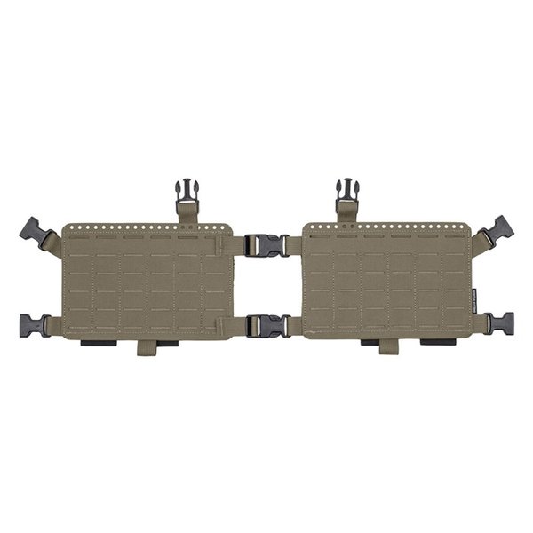 Les panneaux du chest rig sont connectés via deux boucles Fastex glissantes qui offrent un point de connexion sécurisé, ainsi qu'une ouverture et fermeture rapide d'une seule main lors d'activités nécessitant une configuration frontale ouverte (c'est-à-dire en position couchée). Ils permettent également des micro-ajustements à l'avant sans avoir à modifier la largeur de la sangle arrière.