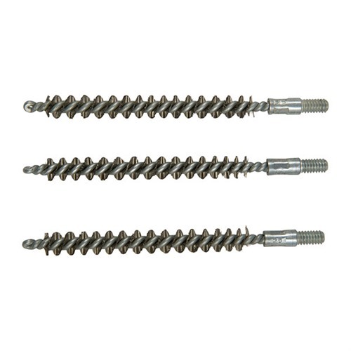 Since darn near as many bore brushes get used in the shop as get sold, we’ve packed these custom-made, top quality brushes in bulk paks to make them more convenient and less expensive. The shank is one-piece, looped and wound (not two, twisted together and chopped off). Stainless Steel Bore Brush - For severely leaded, fouled or rusted bores, the aggressive cleaning action of a stainless steel brush can help get them clean. However, the aggressive action accelerates wear, and regular use can shorten barrel life. SPECS: Bristles: Available in stainless steel. Shank: Steel, looped and wound. Overall length: 3.27" (8.3cm) Threads: .17 and.20 cal. 5-40 threads, all others 8-32 thread.