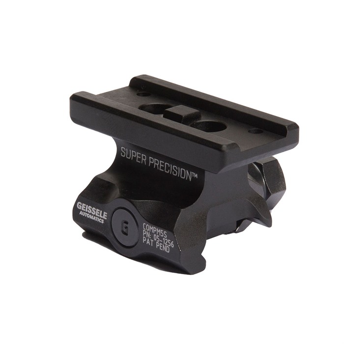 Super Precision® - CompM5s Series Optic Mounts The Super Precision® CompM5s Series was developed specifically to work with the Aimpoint CompM5s and similarly mounted red dot optics. These mounts are precision machined from a single piece of 7075-T6 high strength aluminum and are available in absolute co-witness and 1.93" height options. This mount uses Geissele's update of the classic nut and bolt method, attaching your red dot to your weapon with 1,400 pounds of clamping force, and features 3 shear lugs for maximun rigidity and superior return to zero. They are available in Black Type 3 Hardcoat anodize. Super Precision® - CompM5s Series Optic Mounts, Specification: RED DOT OPTICS SUPPORTED: Aimpoint CompM5s MATERIAL: 7075-T6 High Strength Aluminum HEIGHT: Absolute Co-Witness or 1.93" WEIGHT: 2.1oz (Absolute) 2.5oz (1.93") COLOR: Black FINISH: Type 3 Hardcoat Anodize