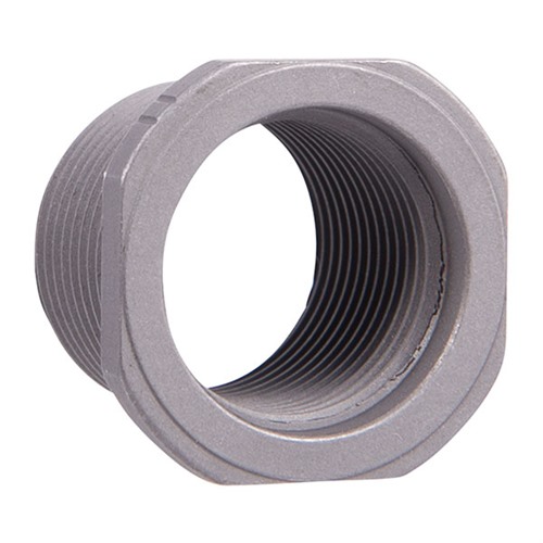 Machined from pre-hardened, stainless steel bar stock. Wrench flats on shoulder make installation and removal for use on multiple devices simple and easy. Compact design moves muzzle device only .100" forward maintaining full thread joint strength. All threads are single point cut in same operation to tight UNEF Class-3 tolerances for perfect concentricity and alignment. Allows attachment of 5/8-24 muzzle devices to a 9/16-24 threaded barrel.