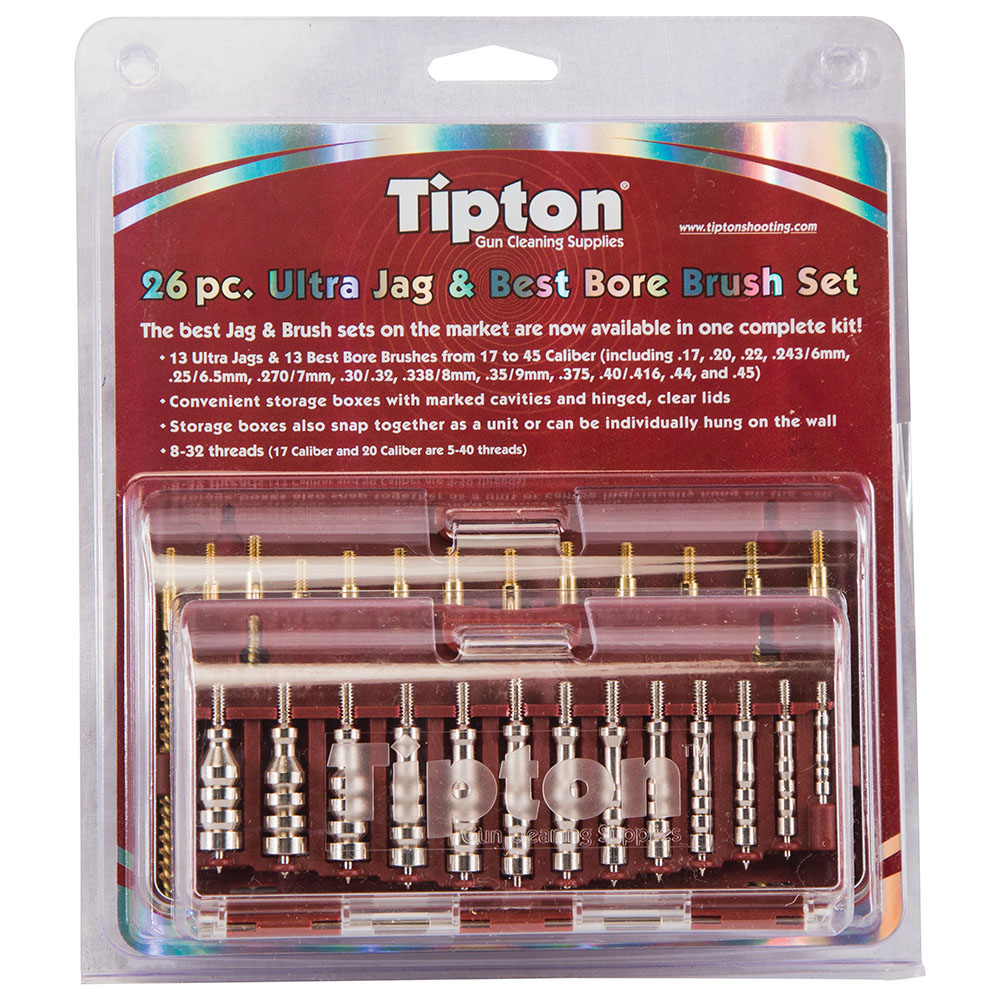 Le set Tipton Ultra Jag/Brush de 13 pièces est idéal pour un nettoyage précis, avec des brosses spécifiques pour calibres .17 à .45 dans une boîte durable.