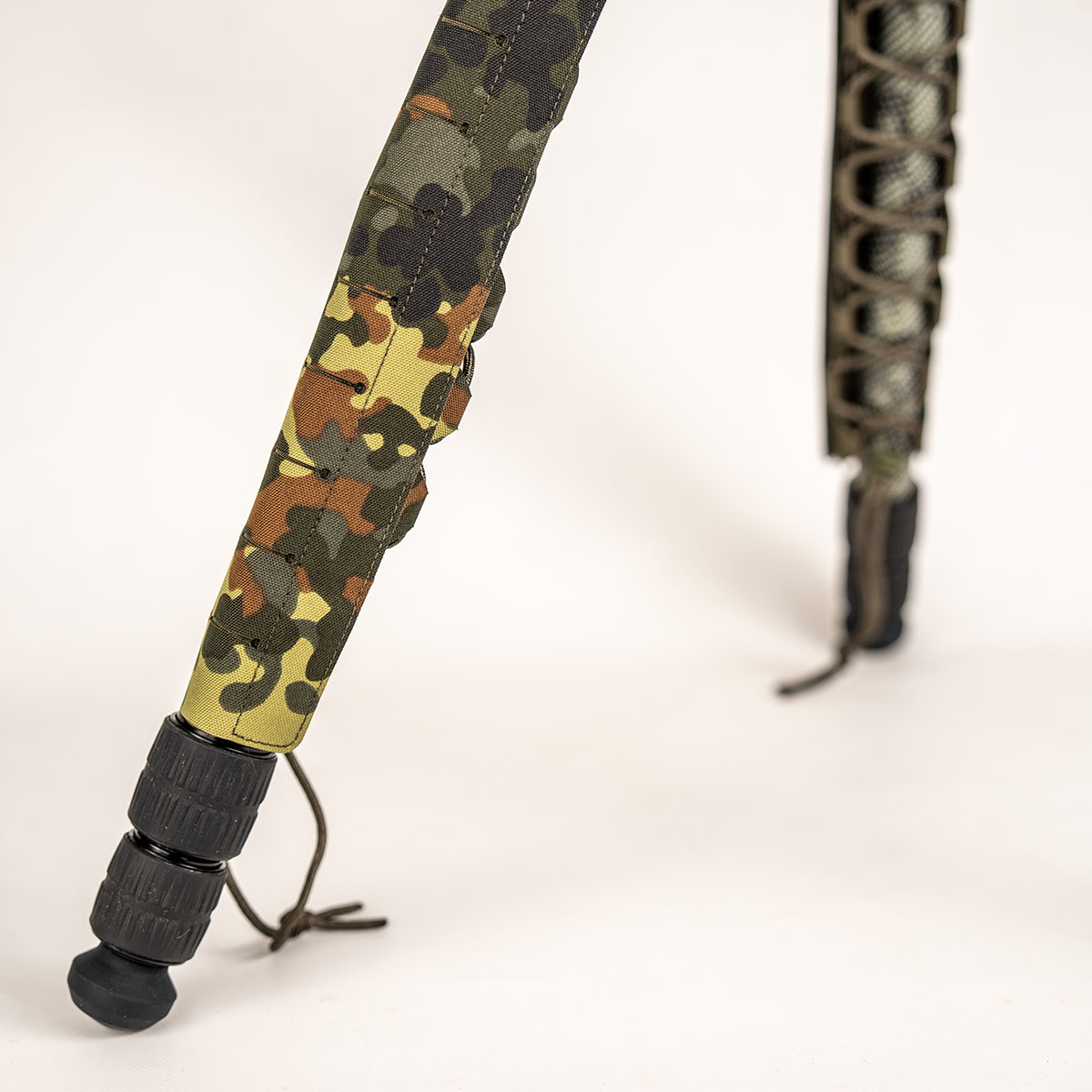 Les enroulements de jambes Tripod Camo GTS sont disponibles en Flecktarn et en Gris Olive Pierre, te permettant d'adapter ton trépied à différents environnements et exigences opérationnelles.