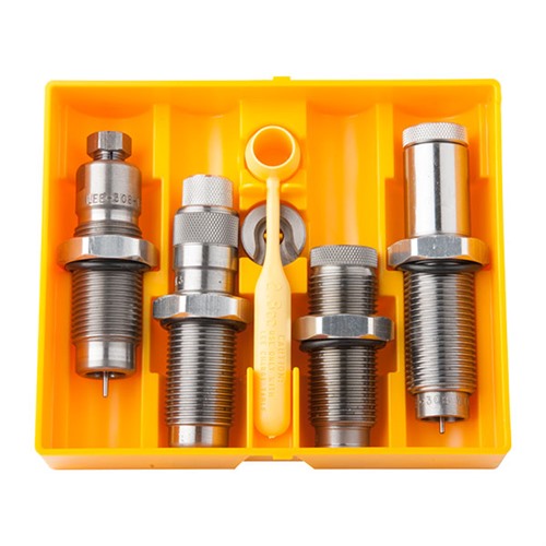 Choose this die set for maximum versatility. The set features a full length-resizing die to return brass to factory new dimensions, perfect for reloading brass fired in other guns. The Collet Neck sizing die is used on your fire formed brass giving you best possible accuracy. No case lube required and cases last almost forever. The Easy Adjust Dead Length Bullet seating die foolproofs the bullet seating adjustment, and assures perfect seating depth every time. The Factory Crimp die provides a secure crimp on bullets with or without a crimp groove. In most cases it helps accuracy by providing a uniform higher start pressure and gives the finished cartridge Factory like accuracy and dependability. The set is complete, with shell holder, powder measure and famous Lee load data featuring all common brands of powder organized in a easy to read logical format. Includes a full length sizer, collet necksizer, Easy Adjust Dead Length Bullet Seating Die & Factory Crimp Die.