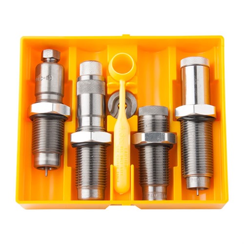 Choose this die set for maximum versatility. The set features a full length-resizing die to return brass to factory new dimensions, perfect for reloading brass fired in other guns. The Collet Neck sizing die is used on your fire formed brass giving you best possible accuracy. No case lube required and cases last almost forever. The Easy Adjust Dead Length Bullet seating die foolproofs the bullet seating adjustment, and assures perfect seating depth every time. The Factory Crimp die provides a secure crimp on bullets with or without a crimp groove. In most cases it helps accuracy by providing a uniform higher start pressure and gives the finished cartridge Factory like accuracy and dependability. The set is complete, with shell holder, powder measure and famous Lee load data featuring all common brands of powder organized in a easy to read logical format. Includes a full length sizer, collet necksizer, Easy Adjust Dead Length Bullet Seating Die & Factory Crimp Die.