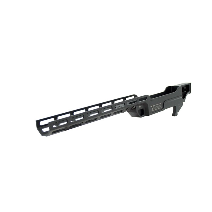 Discover the pinnacle of firearm enhancement with the Vendetta™ chassis system. Crafted from high-quality aluminum, this chassis not only enhances the aesthetics of your firearm but also delivers unparalleled durability and performance. The M-LOK® rail provides a versatile platform for mounting lights and other accessories, allowing you to customize your setup to suit your shooting needs. Ships with Chassis, Rail, Grip Insert, Grip Insert Screw, 6 Rail Screws, and 2 Allen Keys. FEATURES: Material: 6061 T6 Finish: MilSpec Type II Anodized Lightweight Design with Slim Profile (15 oz.) Free Float Rail with Centrally Positioned MLOK® Slots Machined-in QD Sockets Compatible with All Standard AR-style Grips 5° angled back rail for Folding Stocks or Braces Compatible with Fixed Barrel Ruger® 10/22® Pattern Barreled Actions Manufactured in the USA Limited Lifetime Warranty